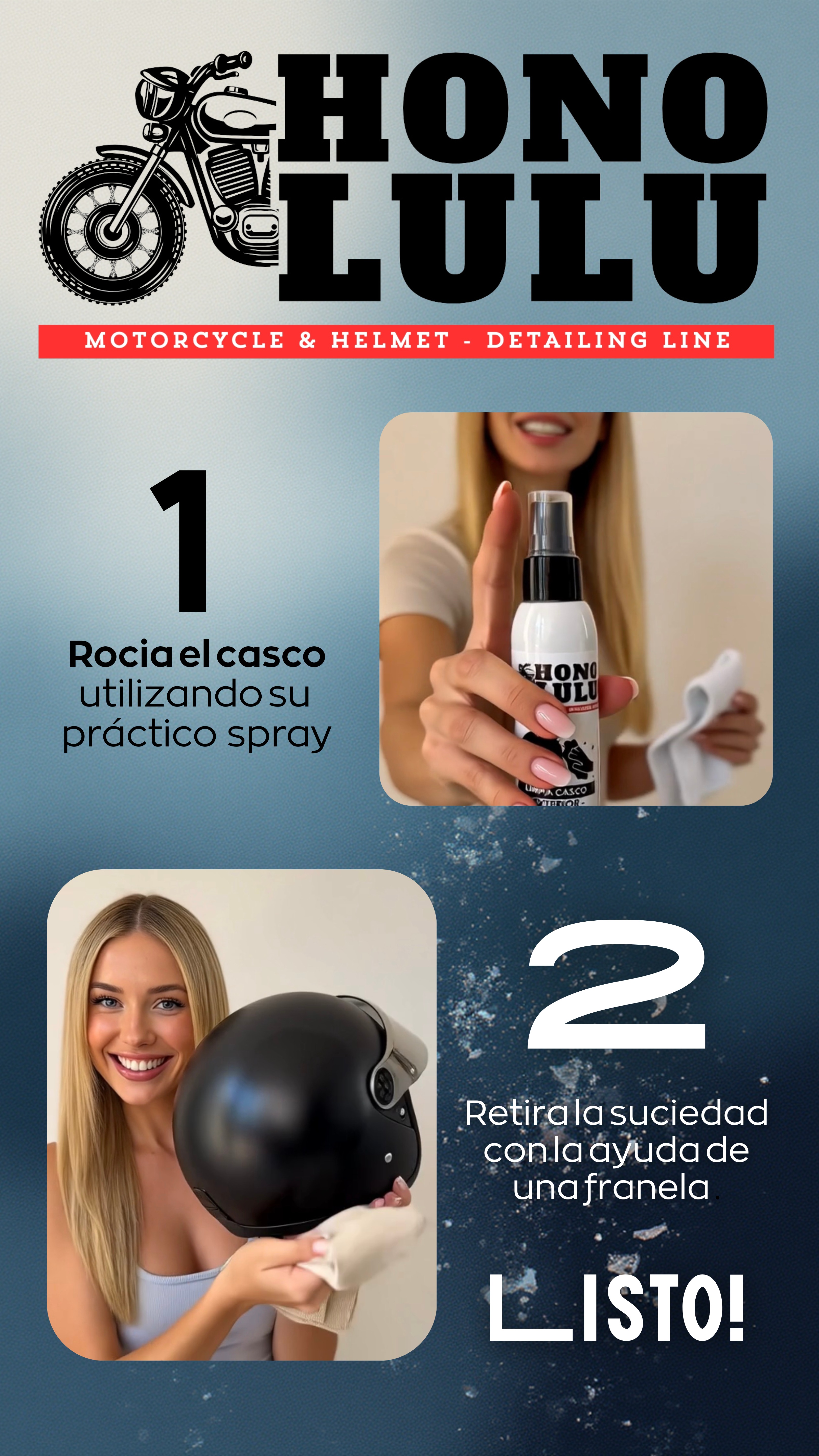 MODO DE USO Rociar el producto sobre la superficie exterior del casco y limpiar con un paño suave y seco para obtener un acabado brillante y sin residuos.